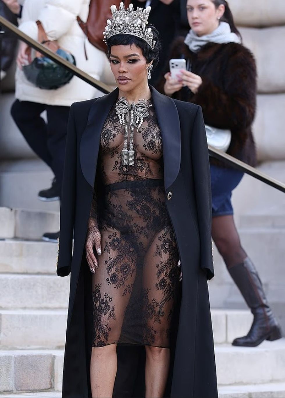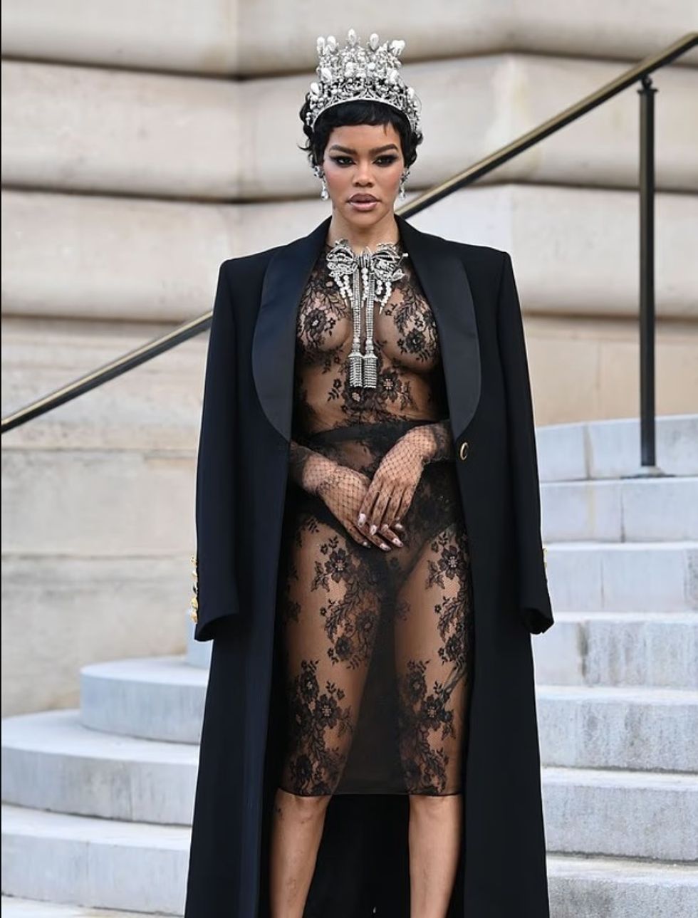 Teyana Taylor, 35 vjeçe dhe e nominuar për çmimin Oscar, bëri bujë me paraqitjen e saj pa reçipeta nën një fustan transparent me dantella, të kombinuar me një pallto në stil smokingu dhe platforma të larta, shkruan DailyMail.