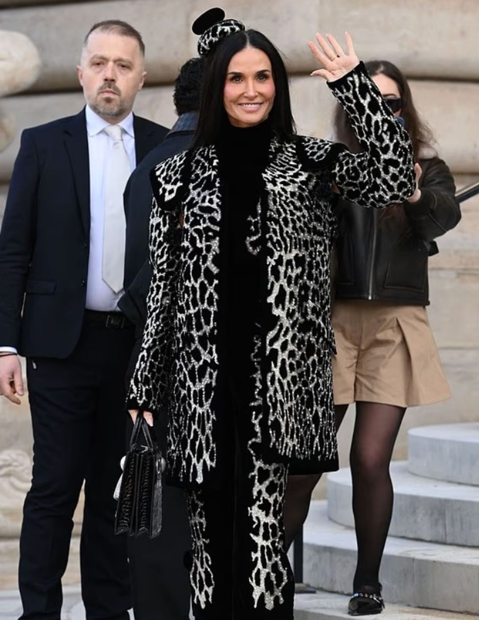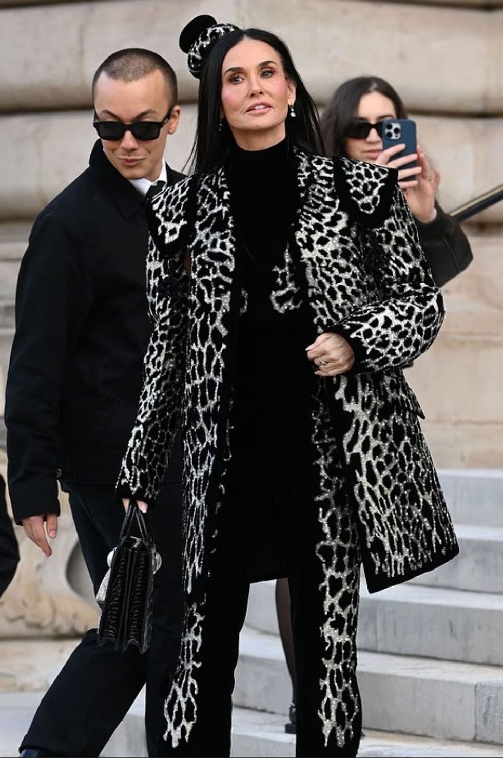 Nga ana tjetër, Demi Moore, 63 vjeç, u shfaq elegante me një kostum me print leopardi, të shoqëruar me një kapelë dhe aksesorë karakteristikë të markës Schiaparelli.