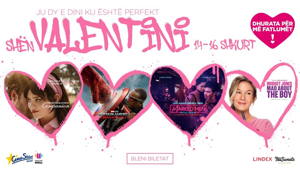 Arsyeja e tretë vjen me shumë dashuri për Shën Valentin nga data 14 deri 16 Shkurt. Romanca e Ditës së Shën Valentinit ju pret në CineStar me dhurata për më fatlumët, dhe me shume filma si Marked Man, Companion, Bridget Jones: Mad About The Boy, dhe hiti Captain America: Brave New World.