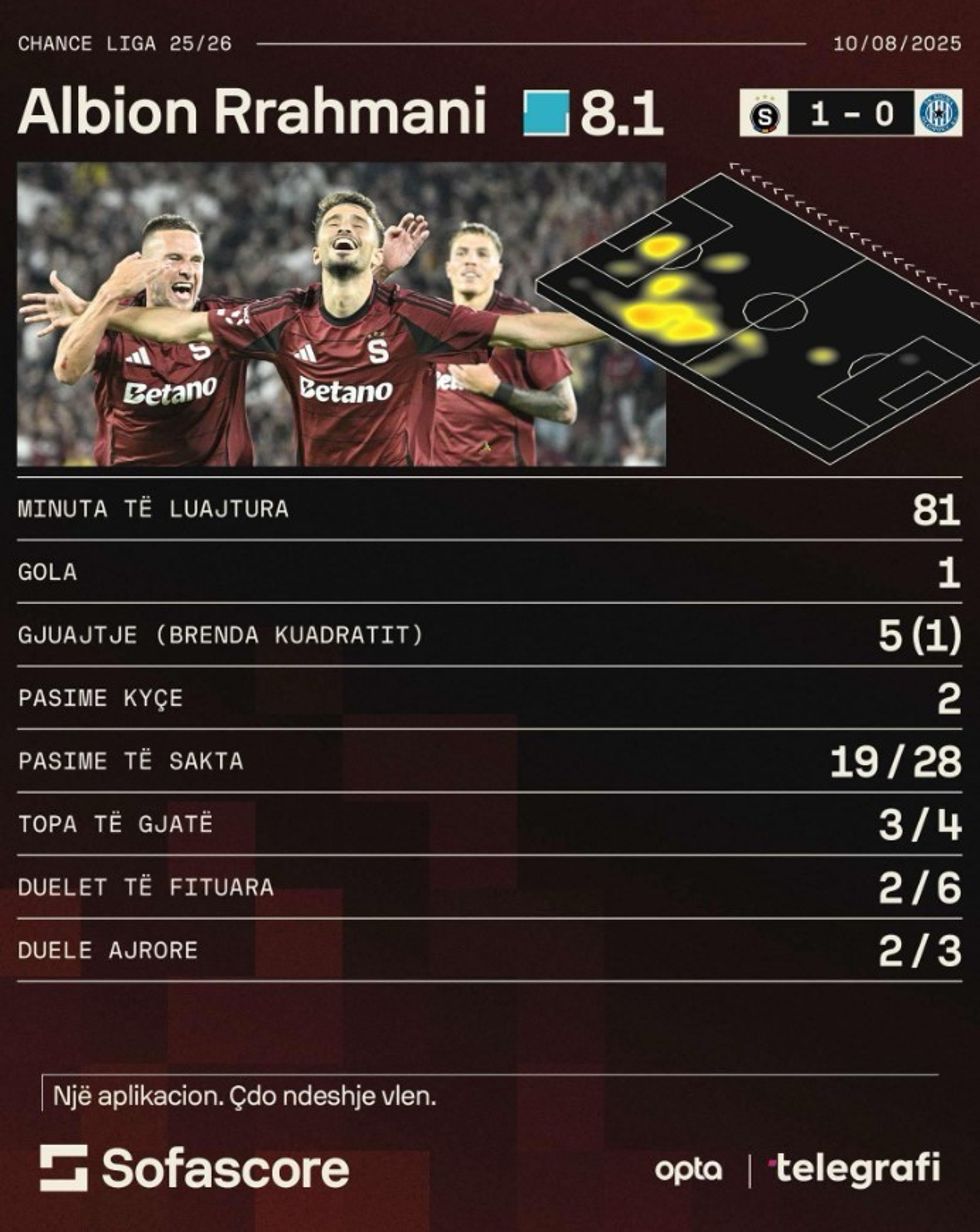 Rrahmani shënoi golin e vetëm për Spartën në këtë ndeshje, duke realizuar për 1-0 në minutën e 56-të të takimit.
