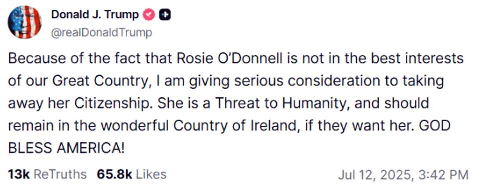 "Për shkak të faktit se Rosie O'Donnell nuk është në interesin më të mirë të vendit tonë, po e shqyrtoj seriozisht heqjen e shtetësisë së saj. Ajo është një kërcënim për njerëzimin", shkroi ai.