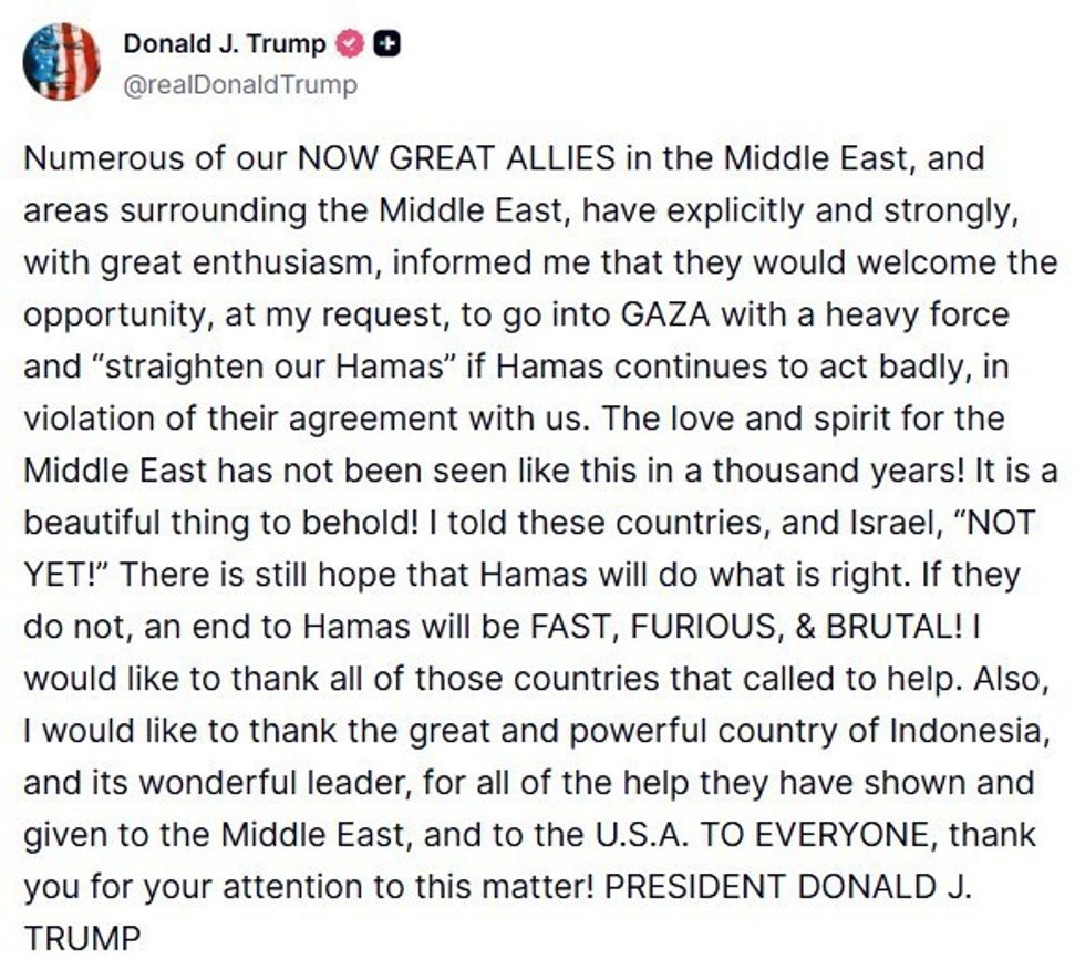 Trump shkroi se disa vende të Lindjes së Mesme thanë se janë gati të dërgojnë trupa në Gaza "nëse Hamasi vazhdon të veprojë keq, duke shkelur marrëveshjen e tyre me ne".
