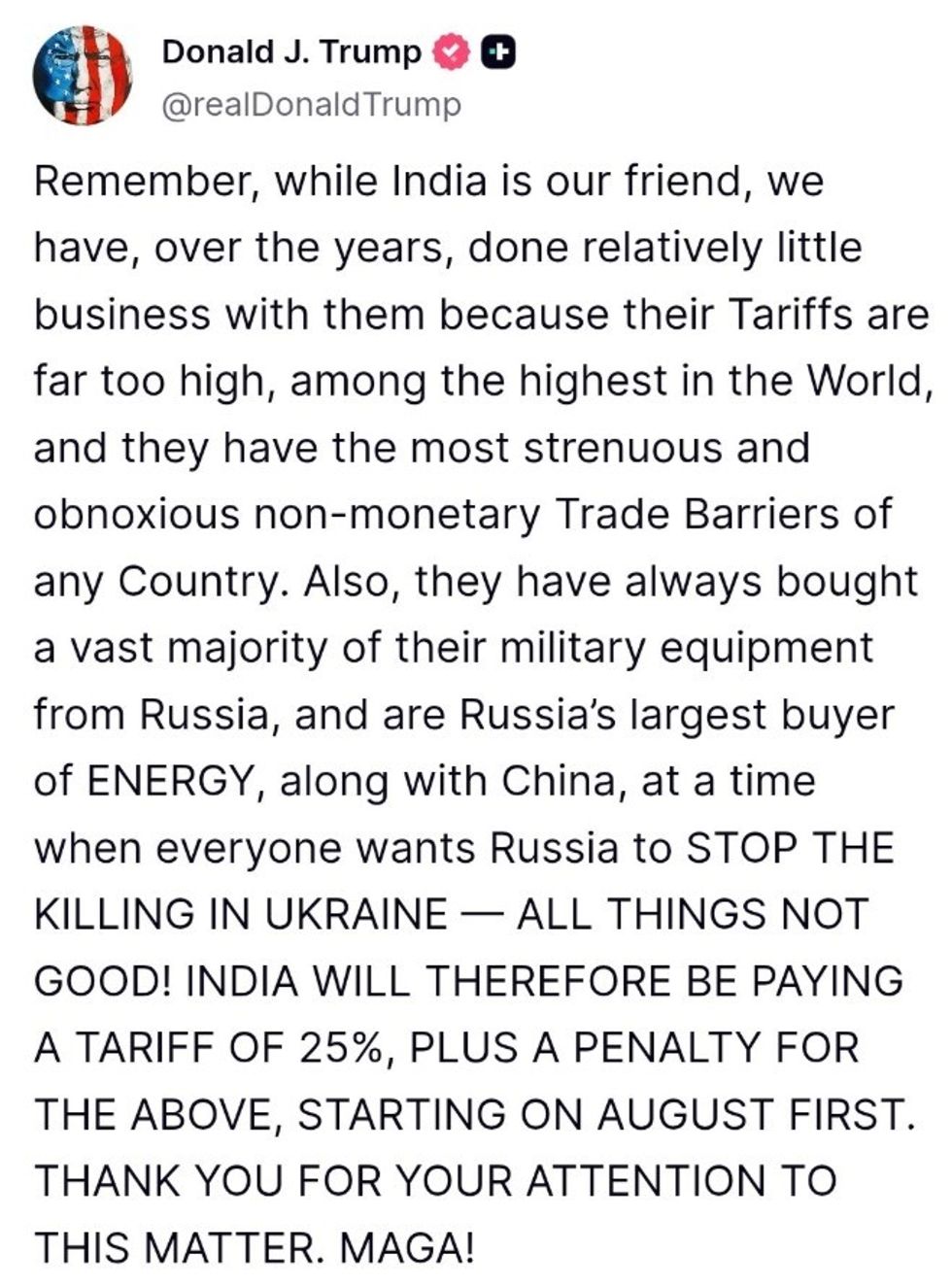 Presidenti amerikan në një mesazh të publikuar të mërkurën në platformën Truth Social, deklaroi se planifikon të vendosë një tarifë doganore prej 25 për qind për mallrat nga India dhe një taksë shtesë për importet, për shkak të blerjes së naftës së papërpunuar nga Rusia nga ana e Indisë.
