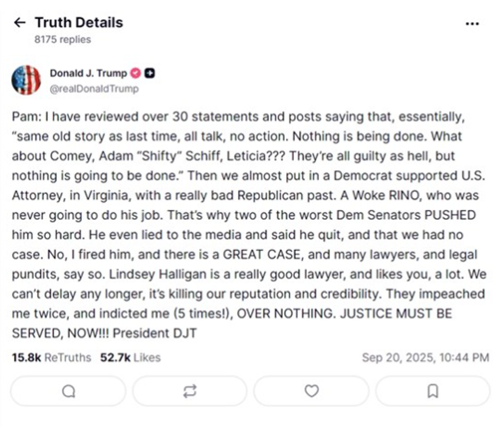 Në një mesazh drejtuar Pam, të publikuar në profilin e tij publik në rrjetin social Truth Social, Trump i bëri thirrje kryeprokurores të ngrejë padi ndaj ish-drejtorit të FBI-së, James Comey, shkruan Futurism.