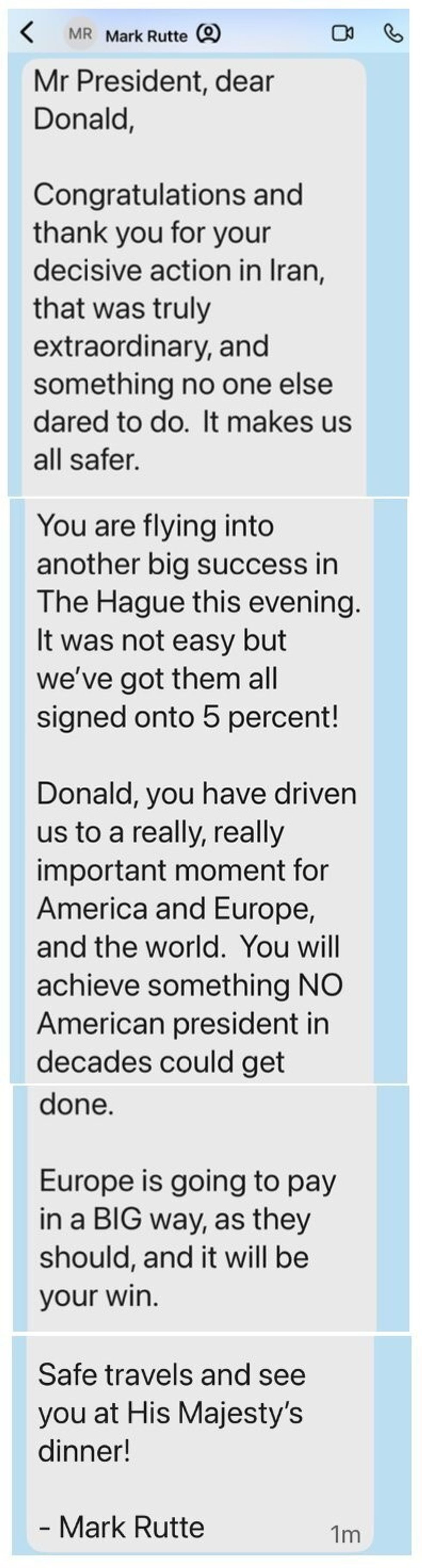 Mesazhi i gjatë, plot lëvdata për presidentin, thotë se ai "na ka bërë të gjithëve më të sigurt" dhe e përgëzon atë për shtyrjen e vendeve të NATO-s që të rrisin angazhimet e tyre të mbrojtjes në 5% të GDP-së deri në vitin 2035.