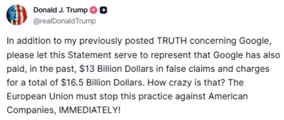 “Sot, Evropa goditi sërish një tjetër kompani të madhe amerikane, Google, me një gjobë prej 3.5 miliardë dollarësh – duke vjedhur në mënyrë efektive para që përndryshe do të përdoreshin për investime dhe krijim vendesh pune në SHBA”, shkroi ai.