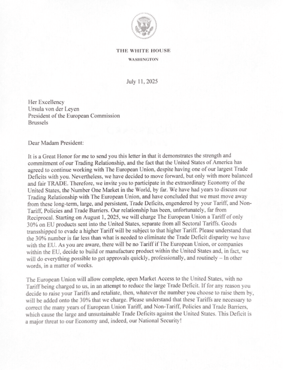 “Zonja e nderuar, Ursual von der Leyen, është nder për mua t’ju drejtohem me këtë letër që thekson rëndësinë e marrëdhënieve tona tregtare. Megjithëse kemi një deficit të madh tregtar me BE-në, SHBA mbetet e përkushtuar ndaj bashkëpunimit, por vetëm në kushte tregtie të ndershme dhe të balancuar. Duke nisur nga 1 gushti 2025, SHBA do të vendosë një tarifë prej 30% për mallrat e BE-së që hyjnë në tregun amerikan, për të korrigjuar këtë pabarazi të vazhdueshme, e shkaktuar nga tarifat dhe barrierat tuaja tregtare”, tha ai.