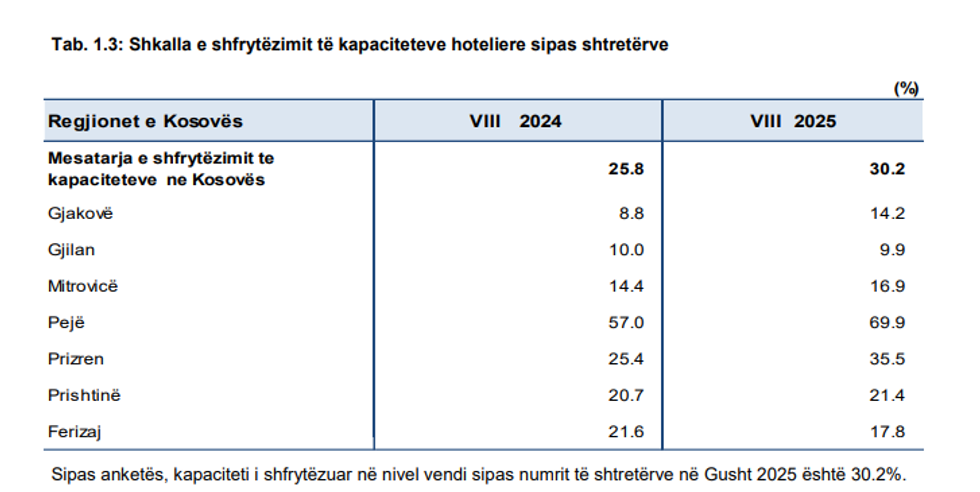 Të dhënat tregojnë se Peja ka qenë destinacioni më i vizituar, me 30,449 vizitorë, e pasuar nga Prishtina me 22,256 dhe Prizreni me 22,215 vizitorë – tri komunat që vazhdojnë të mbajnë peshën kryesore të turizmit vendor dhe ndërkombëtar.