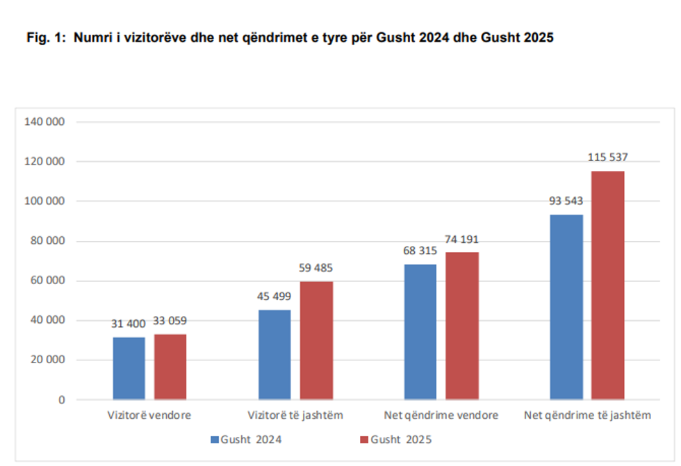Sipas ASK-së, gjatë muajit gusht, në Kosovë kanë hyrë 92,544 vizitorë, që paraqet një rritje prej 20.3% krahasuar me gushtin e vitit 2024, kur ishin regjistruar 76,899 vizitorë.