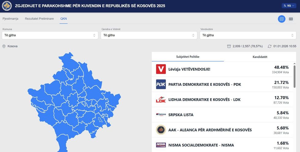 Rezultatet e deritanishme tregojnë se Lëvizja Vetëvendosje (LVV) ka fituar gati 334 mijë vota, duke ruajtur një përqindje prej 48.48%.
