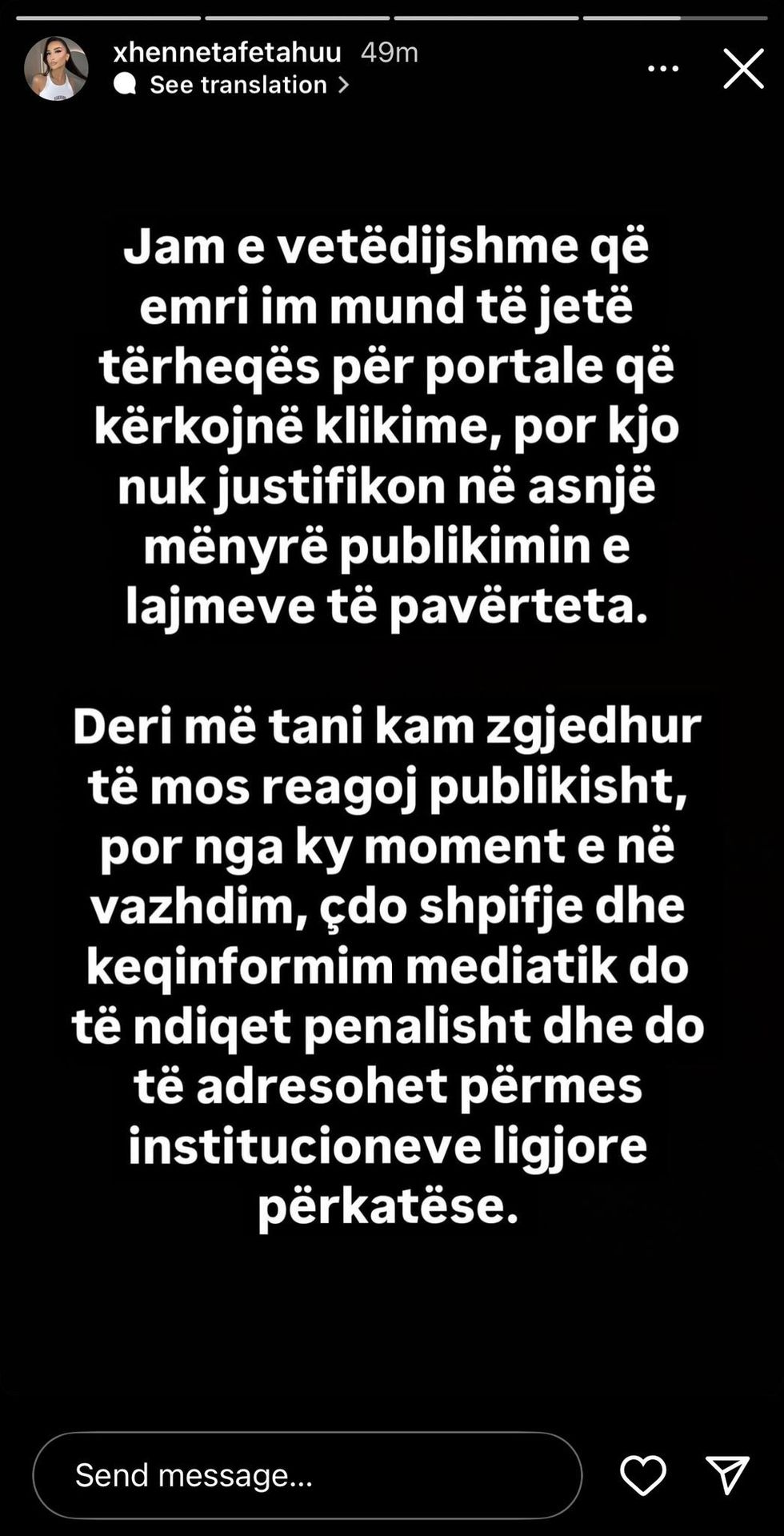 Përmes një postimi në InstaStory, Xheneta ka shprehur pakënaqësinë e saj ndaj këtyre spekulimeve, duke sqaruar se këto raportime janë të pavërteta dhe se ajo ka vendosur të reagojë pas disa ditësh heshtjeje.