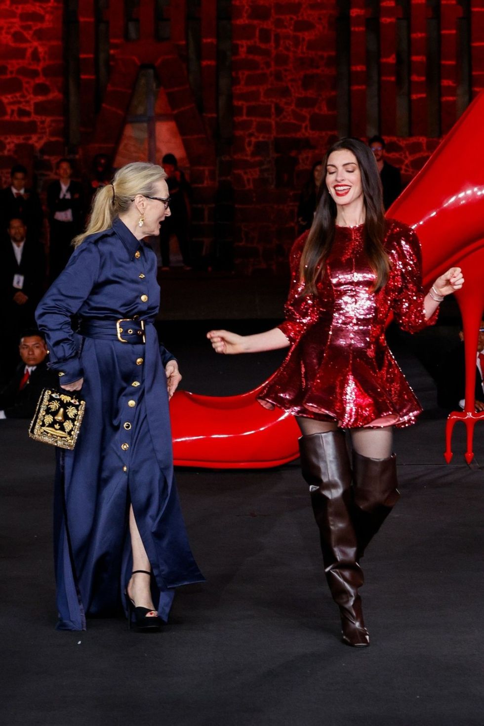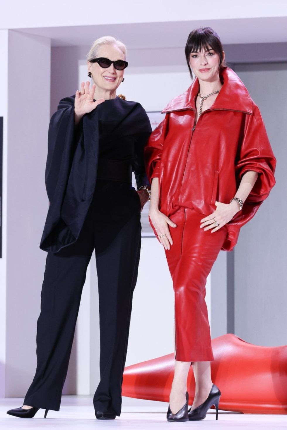 Edhe një paraqitje më herët u komentua gjerësisht, sepse dy aktoret dukeshin sikur kishin “ndërruar rolet”. Meryl u shfaq me kostum të kuq, pantallona elegante dhe sako të prerë në bel, ndërsa Anne zgjodhi pantallona të zeza dhe këmishë të bardhë me mëngë voluminoze, një kombinim mes klasikes dhe modernes, transmeton Telegrafi.