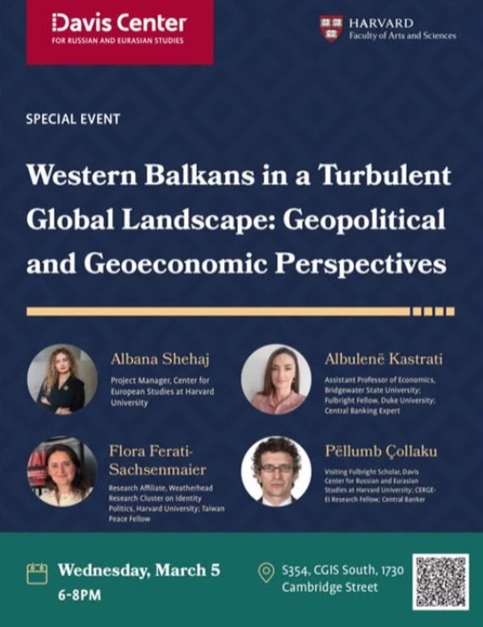 Një diskutim i veçantë në panelin “Ballkani Perëndimor në një Peizazh Global të Trazuar: Perspektiva Gjeopolitike dhe Gjeoekonomike” do të mbahet në ‘Davis Center for Russian and Eurasian Studies’ në Universitetin e Harvardit më 5 mars, nga ora 18:00 deri në 20:00.