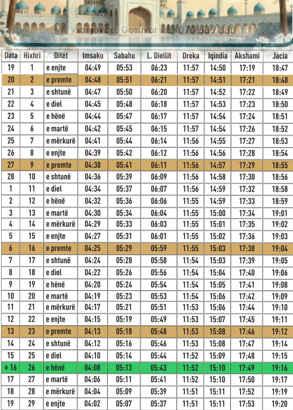 Tabela e publikuar më poshtë paraqet oraret e sakta të syfyrit dhe iftarit për secilën ditë të Ramazanit, sipas vaktisë zyrtare që vlen për territorin e Maqedonisë së Veriut. /Telegrafi/
