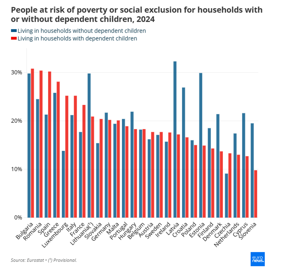 30.8 për qind e bullgarëve që jetojnë në familje me fëmijë në varësi të tyre janë në rrezik nga varfëria ose përjashtimi social.