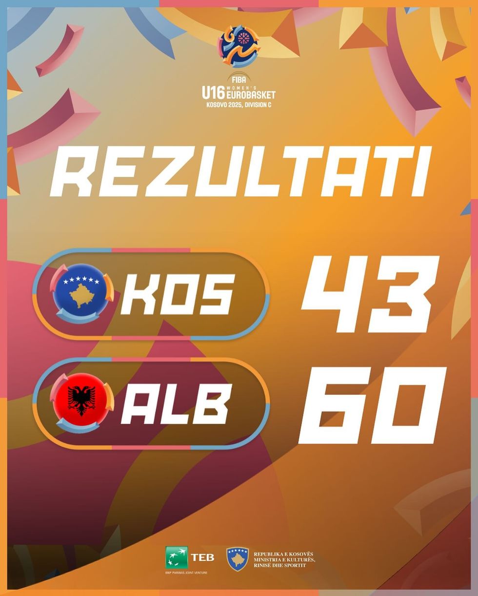Ekipi i femrave të Kosovës U-16 pësoi nga Shqipëria në ndeshjen e parë të FIBA U16 EuroBasket 2025, Divizioni C, me rezultat 43:60 (10:18, 14:15, 13:11, 6:16), takim që u zhvillua në Pejë.