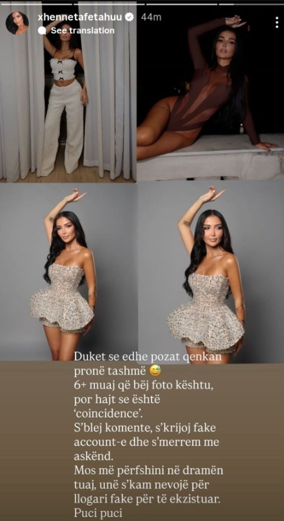 Kur u përball me këto akuza, Xheneta vendosi të reagojë. Përmes një Story në Instagram, ajo hodhi poshtë të gjitha spekulimet. Ajo publikoi një kolazh me fotot e saj dhe shkroi: “Duket se edhe pozat qenkan pronë tashmë. 6+ muaj që bëj foto kështu, por hajt se është ‘coincidence’. S’blej komente, s’krijoj fake account-e dhe s’merrem me askënd. Mos më përfshini në dramën tuaj, unë s’kam nevojë për llogari fake për të ekzistuar. Puçi puçi”.