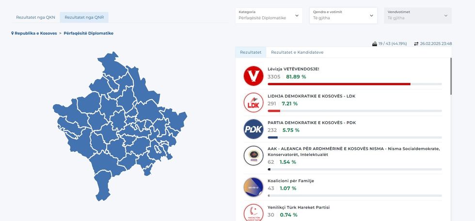 Nga rezultatet deri në ora 23:48 të së mërkurës të publikuara nga KQZ prin Lëvizja Vetëvendosje me 81.89 për qind të votave, ndërsa nga 43 vendvotime janë procesuar 19 sosh.