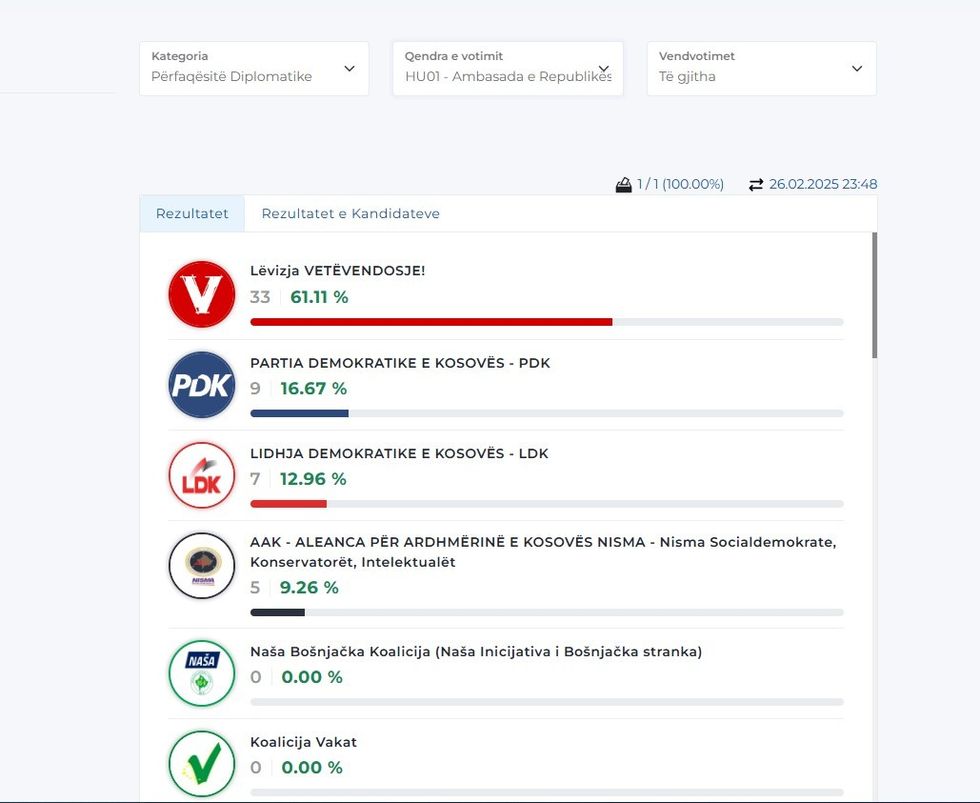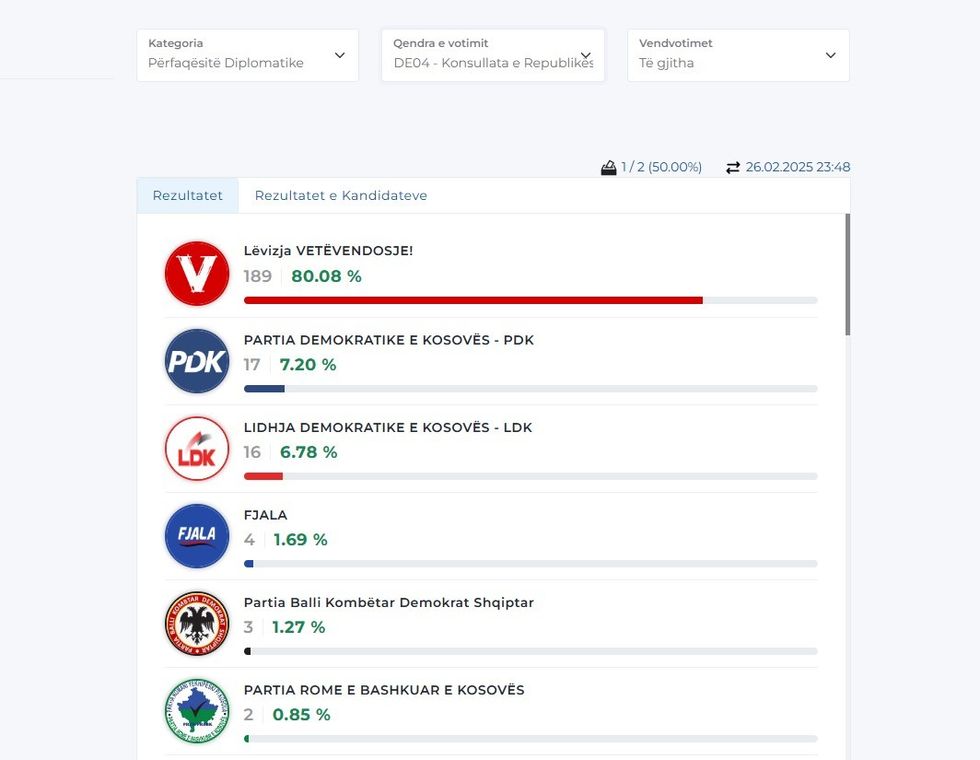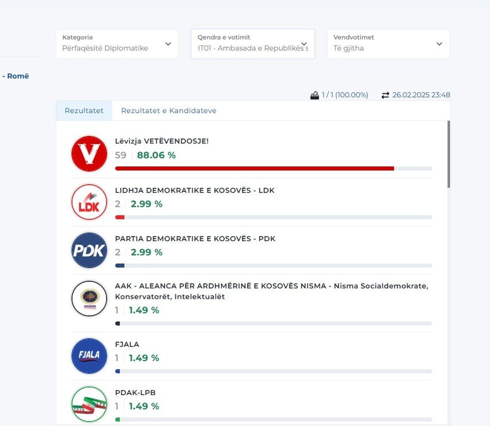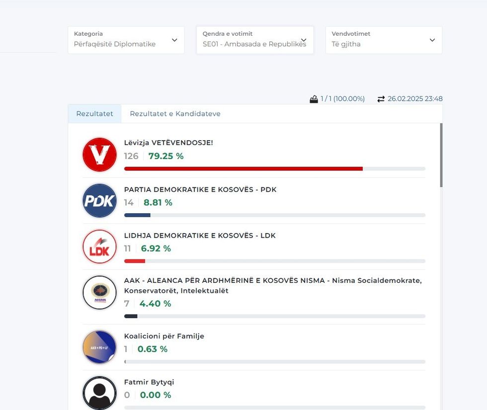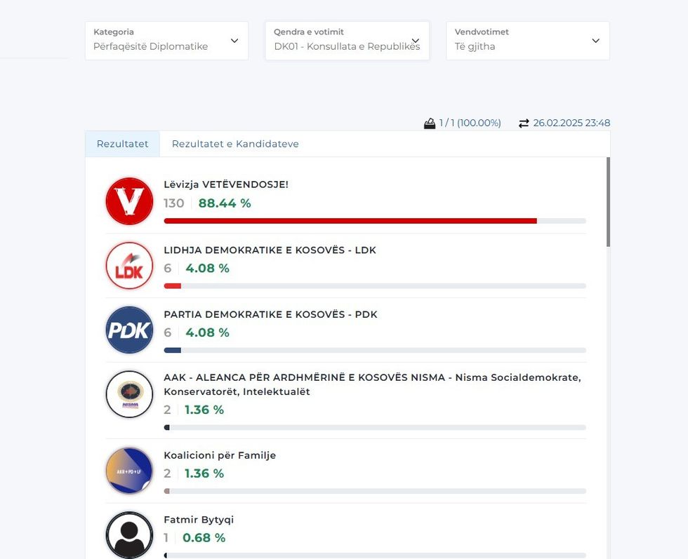 Më poshtë mund t’i gjeni rezultatet nga disa përfaqësi diplomatike, gjersa për disa ende nuk ka filluar numërimi. /Telegrafi/