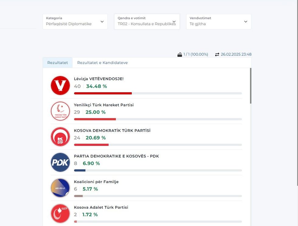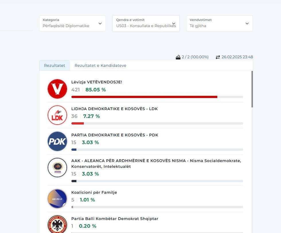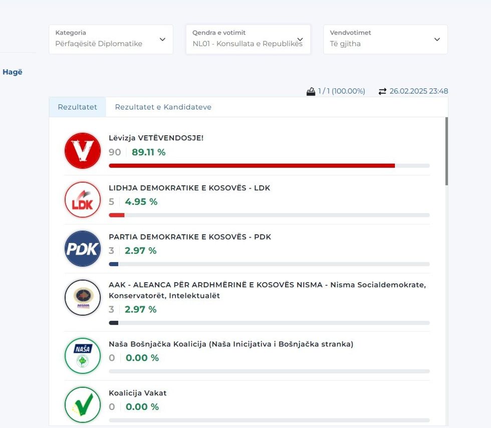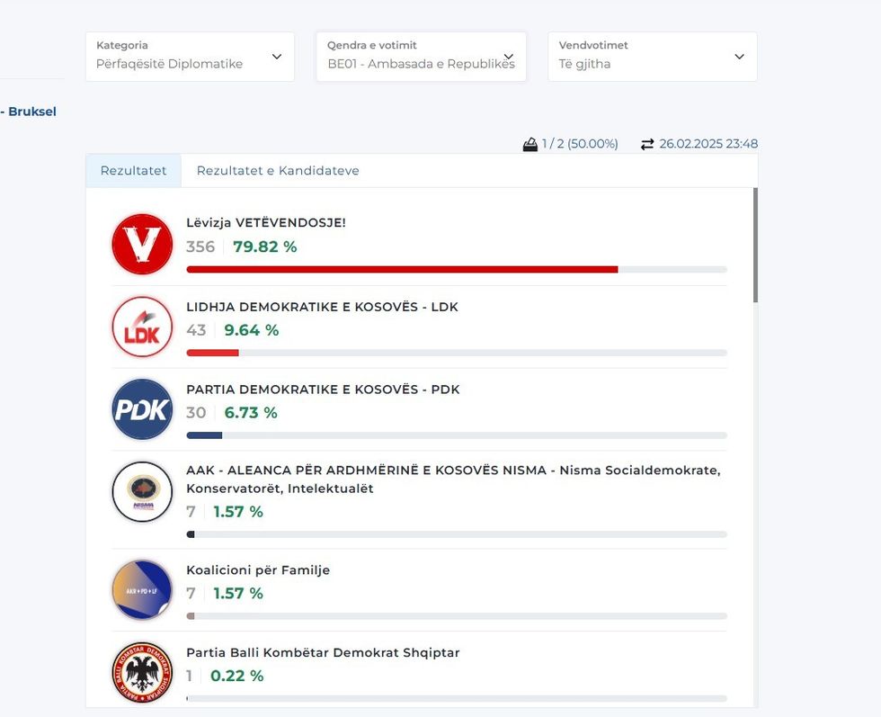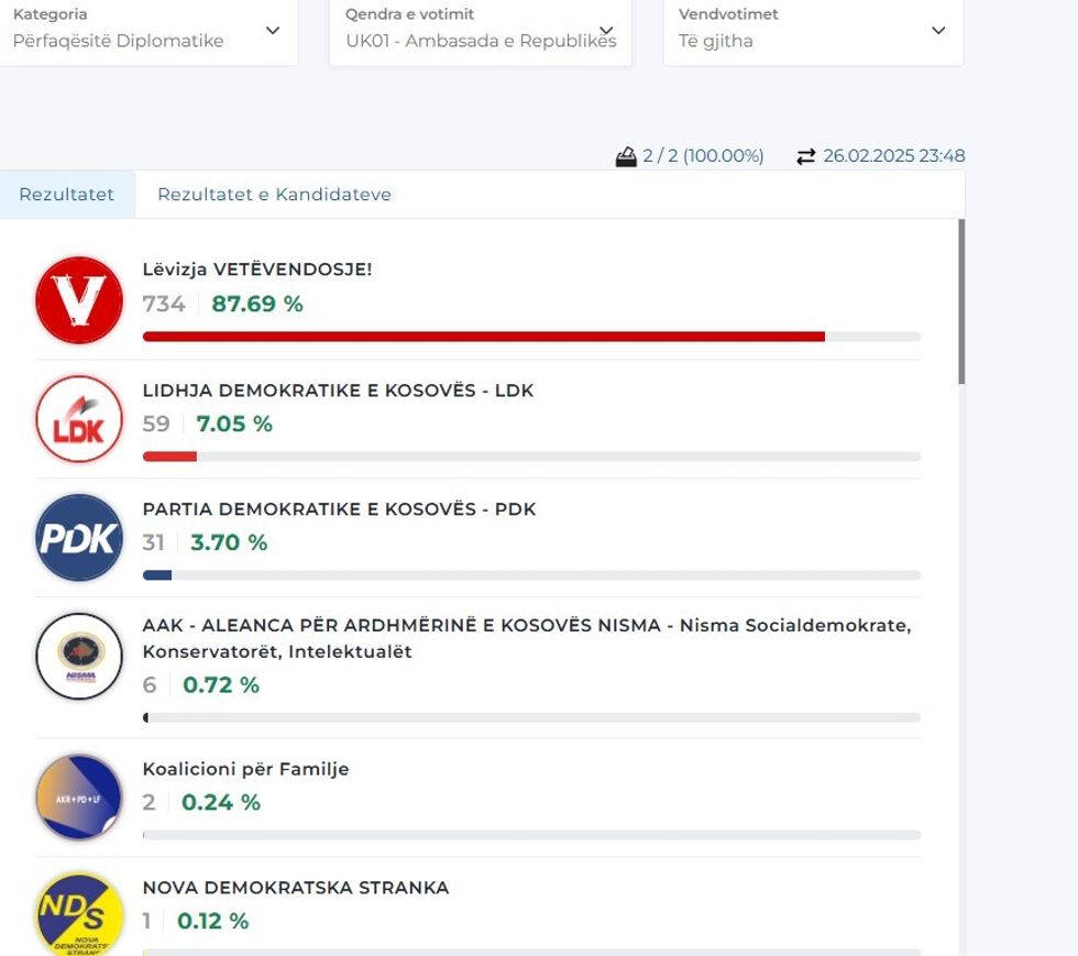Më poshtë mund t’i gjeni rezultatet nga disa përfaqësi diplomatike, gjersa për disa ende nuk ka filluar numërimi. /Telegrafi/