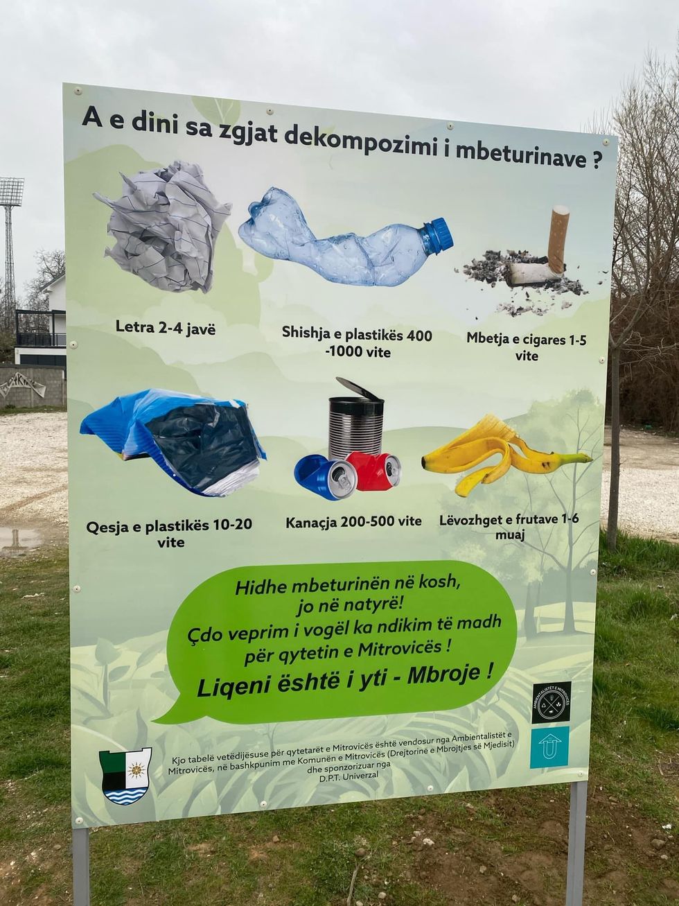 “Sot, në hapësirat e Liqenit Akumulues, në vazhdën e aksioneve vetëdijesuese dhe ndërgjegjësuese, në bashkëpunim me Ambientalistët e Mitrovicës dhe D.P.T Universal, është vendosur një tabelë informuese me titullin “Koha e Dekompozimit të Mbeturinave”. Kjo tabelë ka për qëllim të informojë qytetarët mbi ndikimin që kanë mbeturinat në mjedis dhe rëndësinë e hedhjes së tyre në vendin e duhur”, ka thënë Sadiku. /Telegrafi/
