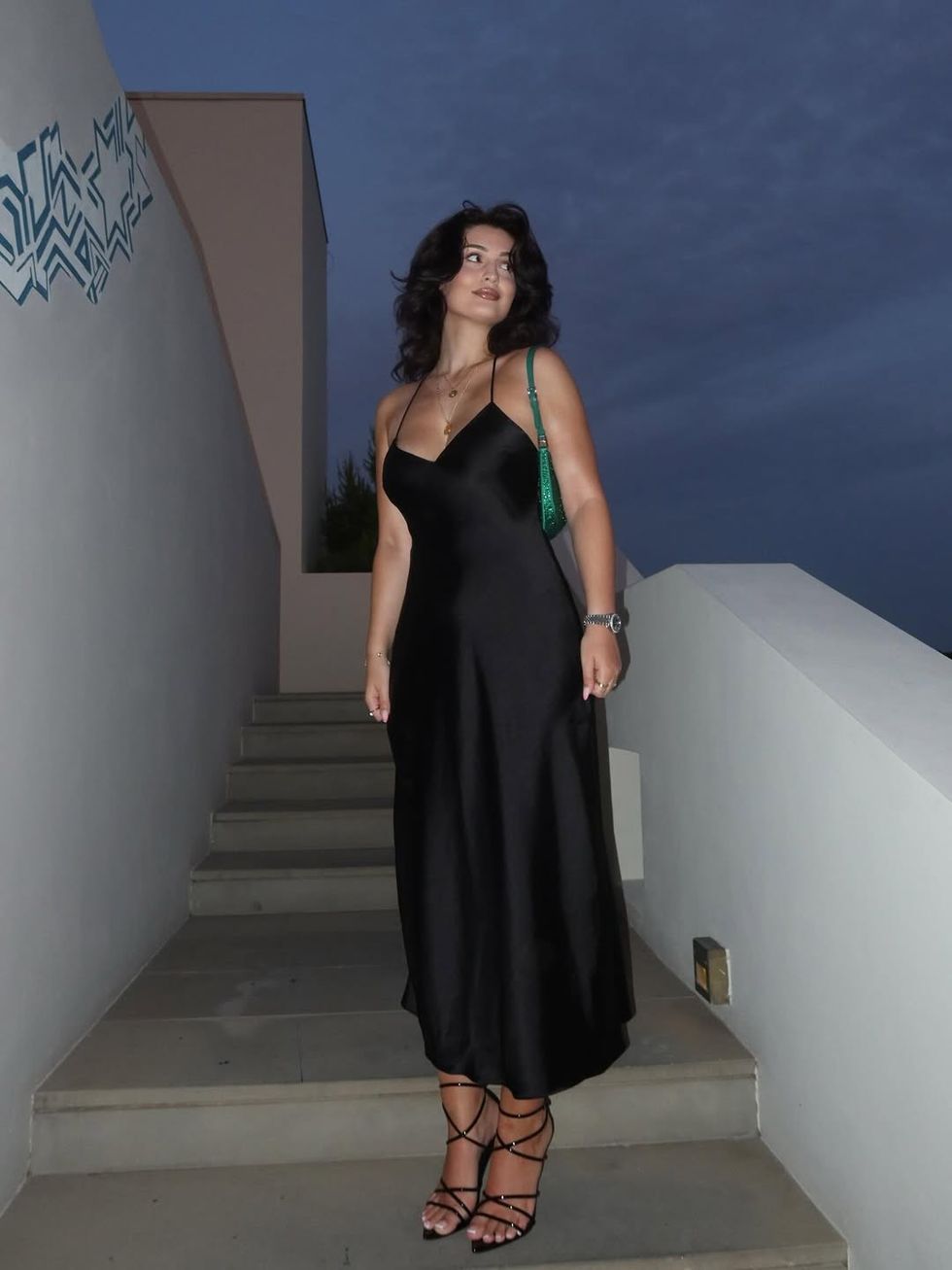 Në fotot që postoi, Vesa shfaqet e veshur me një fustan të zi prej sateni, që përqafon trupin e saj me finesë, duke i dhënë një pamje elegante dhe joshëse. Ambienti bregdetar gjatë natës dhe atmosfera e bënin setin fotografik të duket si një skenë filmike.