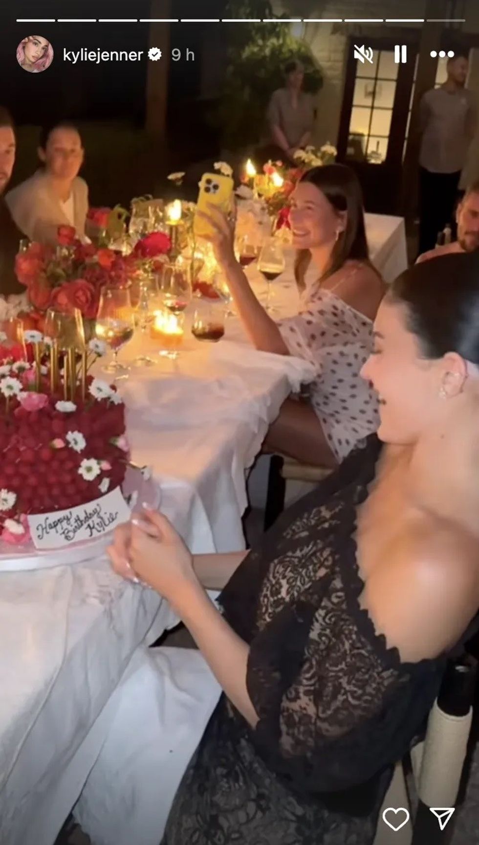 Pamjet në Instagram treguan se lista e të ftuarve ishte e kufizuar - jo më shumë se 20 miq e familjarë të afërt rreth tavolinës. Përkrah festueses kryesore, Hailey dhe Justin Bieber u panë buzëqeshur gjatë këngës “Happy Birthday”. Hailey, themeluese e markës Rhode, ndoqi po ashtu frymën retro-italiane me një fustan të bardhë, të shkurtër, me supe të zbuluara dhe me pika të zeza. Si edhe Jenner, ajo kishte një bust të mbledhur dhe mëngë të grumbulluara, me efekt gjysmë-transparent. Edhe pse fustani nuk u identifikua ende, çanta e telefonit të saj ishte qartë nga koleksioni Rhode në të verdhë limoni, një tjetër inspirim ushqimor i saj i fundit.