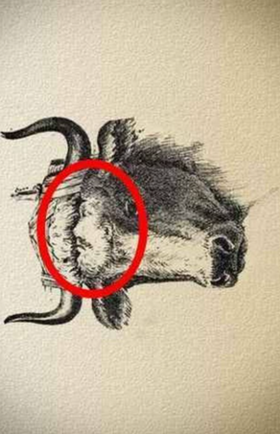 Në shikim të parë, imazhi duket si një kokë lope e zbukuruar me detaje të ndërlikuara, por diku brenda saj është i fshehur një fermer.