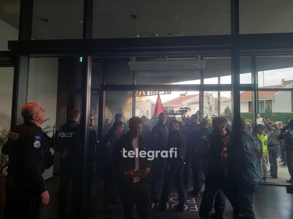 Ata protestuan kundër vizitës së Trendafilovas, ndërsa një numër i pjesëtarëve të Policisë së Kosovës ishin të pranishëm.