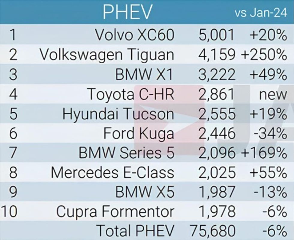 Në total, 75,680 hibrid plug-in gjetën pronarë të rinj, që është dukshëm më pak në krahasim me tregun në rritje të automjeteve tërësisht elektrike.