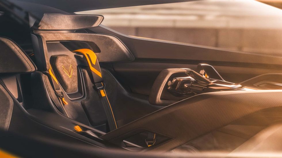 Pjesa e brendshme është e veshur me lëkurë të kuqe Inferno me detaje alumini të lëmuar dhe fibra karboni, dhe timoni me një ekran të vogël qendror shton përshtypjen futuriste. Është interesante se koncepti nuk ka ekranin klasik qendror me prekje. Në vend të kësaj, i gjithë xhami i përparmë shërben si një ekran masiv në kokë, ndërsa të gjitha kontrollet janë të integruara në timon.