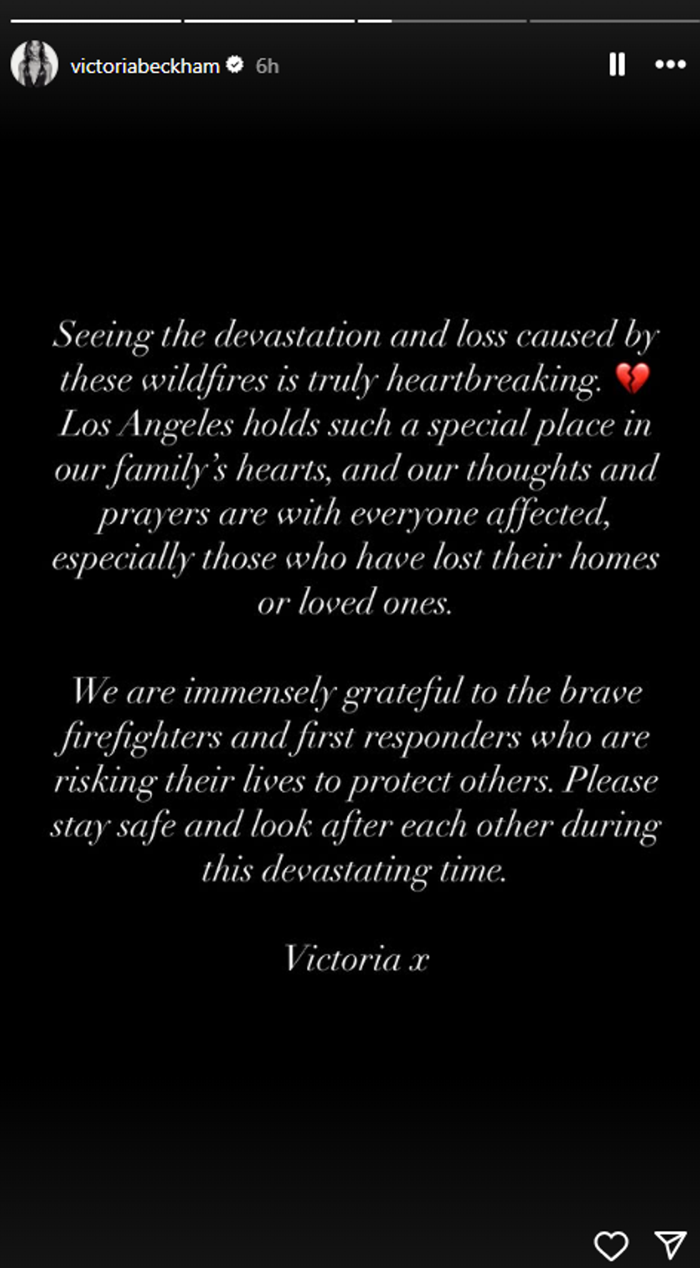 "Ne jemi jashtëzakonisht mirënjohës për zjarrfikësit e guximshëm dhe reaguesit e parë që rrezikojnë jetën e tyre për të mbrojtur të tjerët. Ju lutemi qëndroni të sigurt dhe kujdesuni për njëri-tjetrin gjatë kësaj kohe të vështirë", përfundoi Victoria.