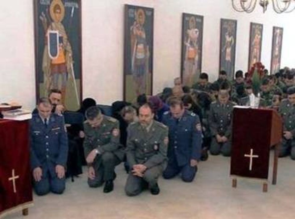 Ushtarë të tjerë të gjunjëzuar në një kishë para ikonave ortodokse, në një përzierje të drejtpërdrejtë mes ushtrisë dhe fesë.