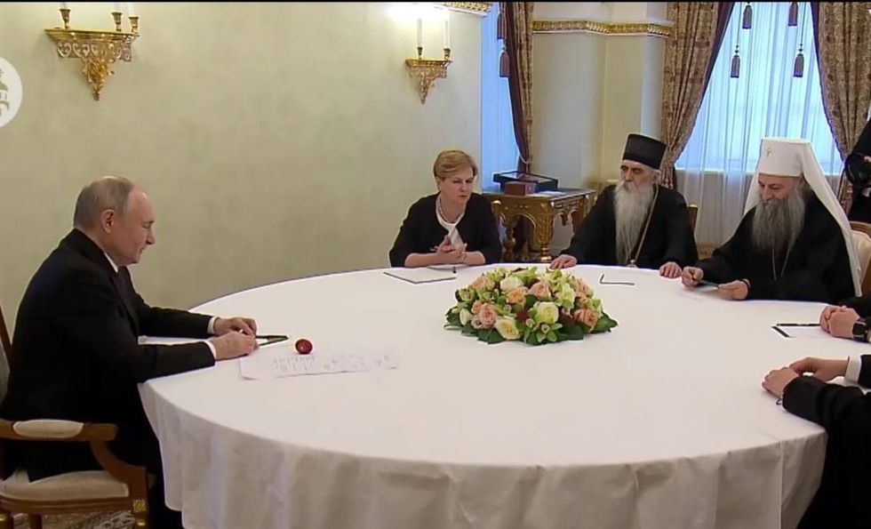 Kjo pamje tregon presidentin rus Vladimir Putin në një takim zyrtar me udhëheqës të Kishës Ortodokse Serbe, përfshirë patriarkun Porfirije.