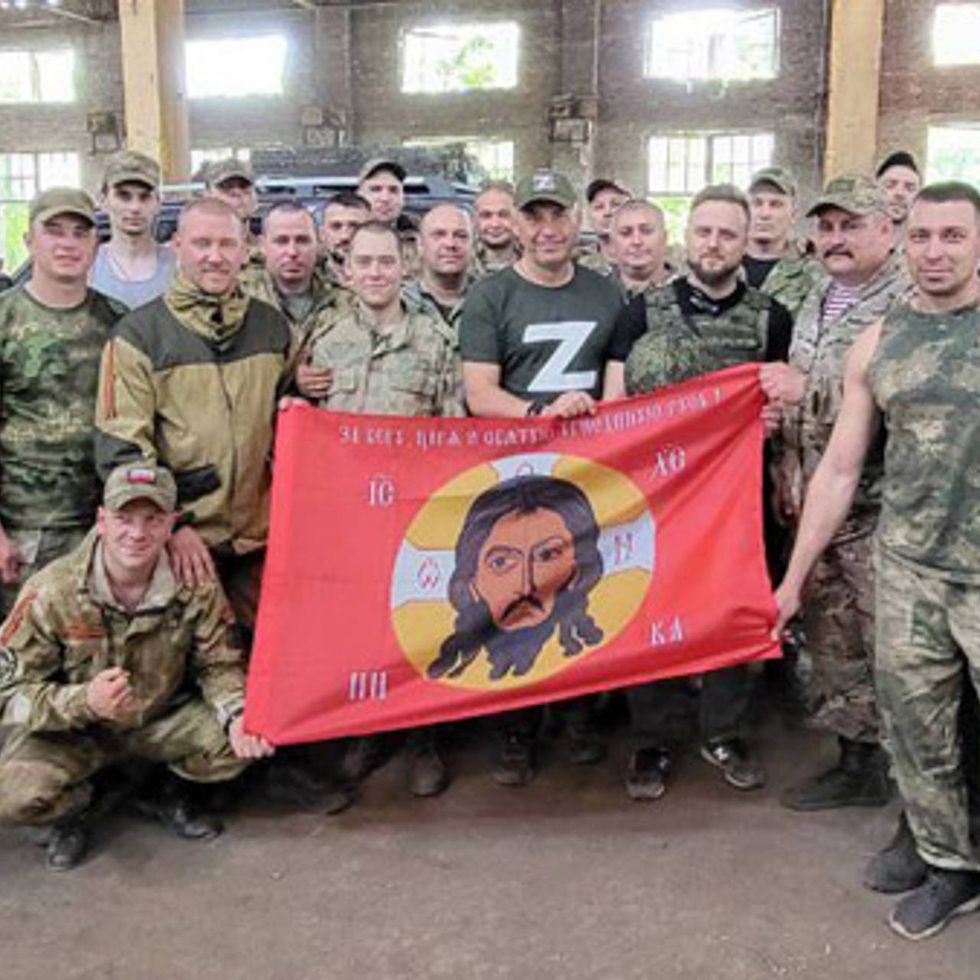 Në këtë foto shfaqet një grup ushtarësh të veshur me uniforma ushtarake, ndërsa disa prej tyre mbajnë një flamur të kuq me ikonografinë e Krishtit dhe një mbishkrim në cirilik.