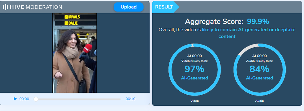 Edhe videoja e publikuar nga “Revista Ora” rezulton të jetë gjeneruar me inteligjencë artificiale, bazuar në analizën e platformës Hive Moderation, ku ka marrë një vlerësim prej 95%.