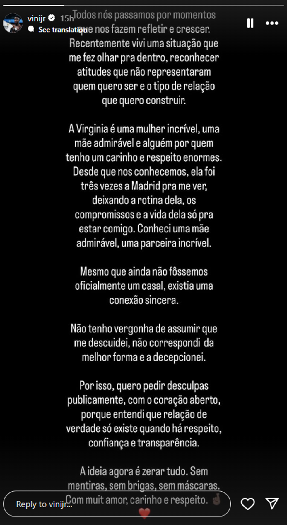 Në postimin e tij në Instagram, Vinicius shkruante: “Virginia është një grua e jashtëzakonshme, një nënë e admirueshme dhe dikush për të cilin ndiej afeksion dhe respekt të madh… Unë nuk kisha vepruar në mënyrën më të mirë dhe e zhgënjeva atë. Kjo është arsyeja pse dua të kërkoj falje publikisht… Tani dua të fillojmë nga e para: pa gënjeshtra, pa debate, me shumë dashuri, afeksion dhe respekt”.
