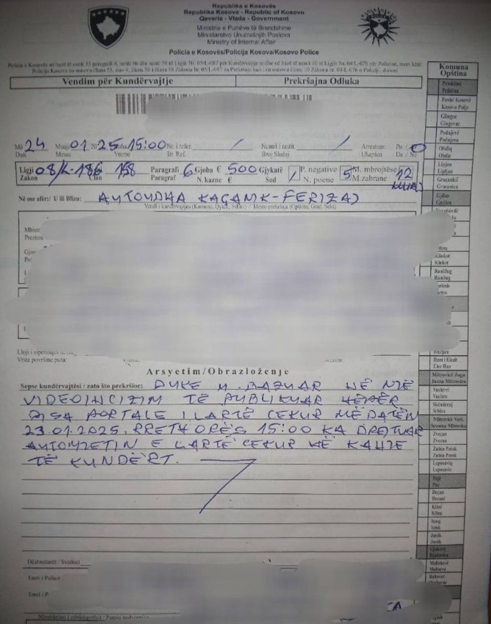 “Me datën 23.01.2025 në rrjete sociale është publikuar një video-incizim i një automjeti duke qarkulluar në kahje të kundërt në Autostradën 'Arben Xhaferi'. Njësia për Kontroll të Autostradave në bashkëpunim me stacionin Policor – Hani i Elezit ka identifikuar shoferin që ka drejtuar mjetin në kahjen e kundërt, i njëjti është gjobitur me 500€, 5 pikë negative dhe i është ndaluar drejtimi i automjetit në kohëzgjatje prej dymbëdhjetë (12) muaj”, thuhet në njoftimin e policisë. /Telegrafi/