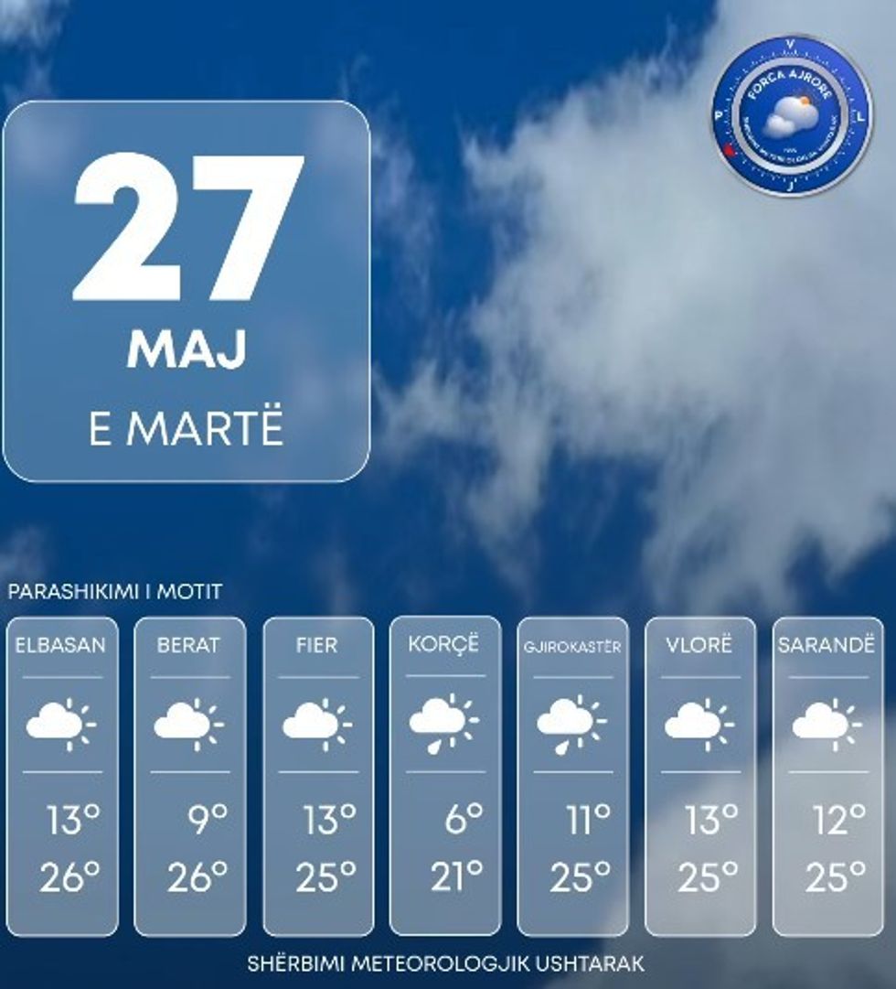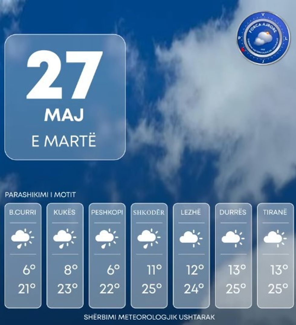 Shërbimi Meteorologjik Ushtarak bën të ditur se për të martën në Shqipëri parashikohet mot kryesisht i kthjellët si dhe alternime vranësirash kalimtare mesatare dhe hera-herës deri të dendura në zonën e veriut dhe relievet malore në lindje.