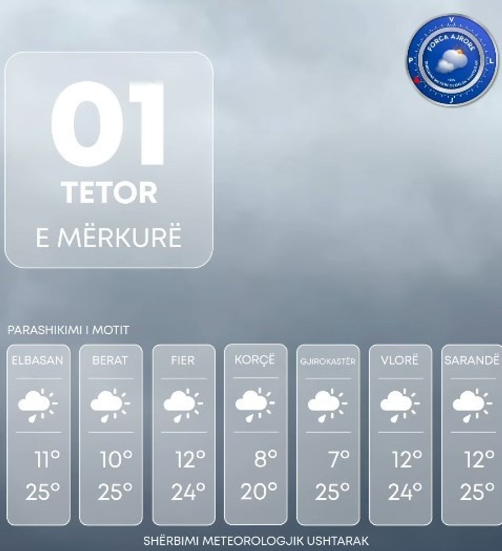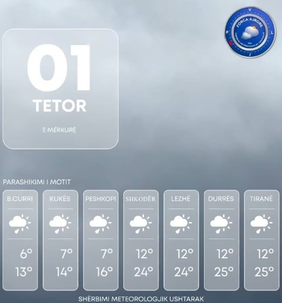 Reshjet e shiut pritet të nisin fillimisht përgjatë zonës lindore në orët e mesditës, me intensitet të ulët, ndërsa gradualisht reshjet do të shpërndahen në pothuajse të gjithë territorin me intensitet të ulët si dhe lokalisht shtrëngata.