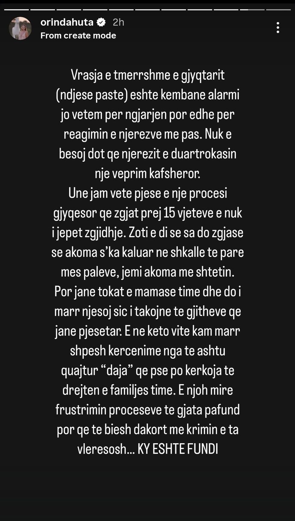 Moderatorja e njohur, Orinda Huta, ka reaguar me indinjatë pas vrasjes së gjyqtarit në Shqipëri duke e cilësuar ngjarjen si një “këmbanë alarmi” për shoqërinë dhe mënyrën se si njerëzit po reagojnë ndaj dhunës.