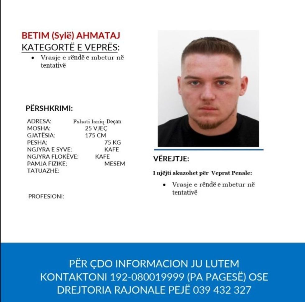Në njoftimin e policisë bëhet e ditur se personi i kërkuar, Betim Sylë Ahmataj është i lindur më 23.02.2000 nё Deçan, ndërkaq kërkohet për veprat penale ‘vrasje e rëndë e mbetur në tentativë’.