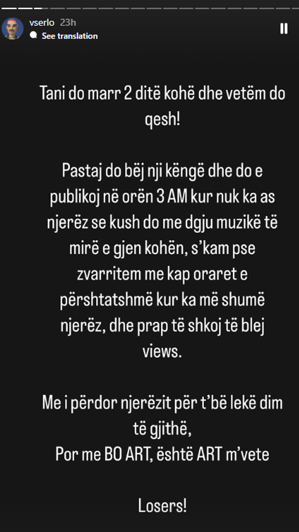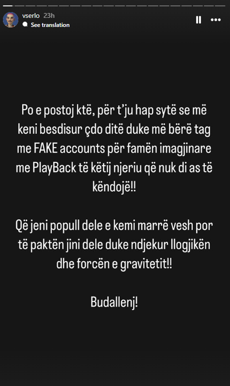 “Po e postoj këtë për t’ju hapur sytë, se më keni lodhur çdo ditë duke më bërë tag me llogari false për famën imagjinare dhe playback-un e këtij njeriu që nuk di as të këndojë. Që jeni popull dele e kemi marrë vesh, por të paktën jini dele që ndjekin logjikën dhe forcën e gravitetit! Budallenj!”, tha ndër të tjerash ai.