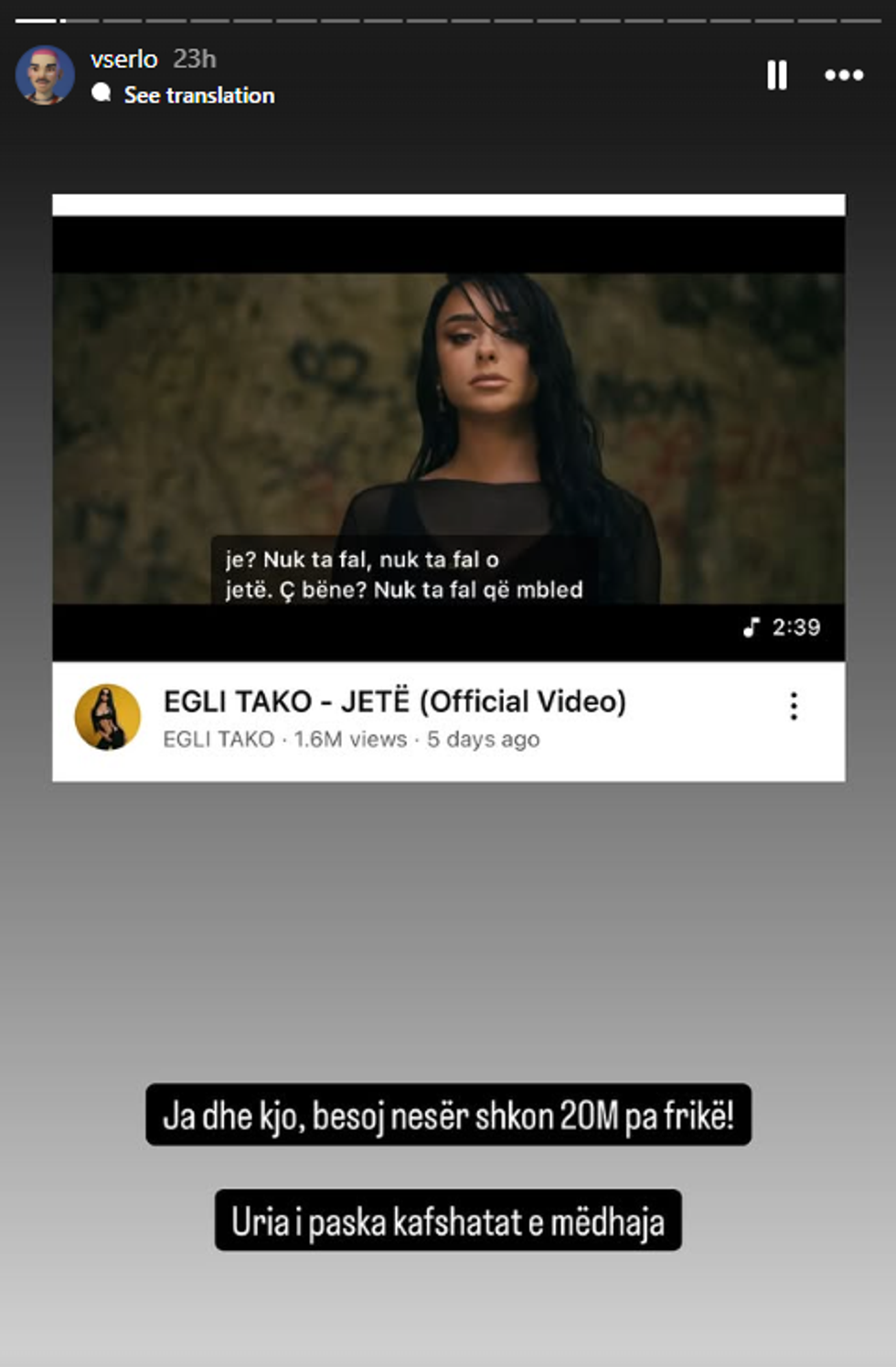 Ish-banori i Big Brother VIP Albania 4, Vserlo, ka reaguar në InstaStory për këngën e re të Gjestit “Veshu ndrequ”, e cila kaloi mbi një milion klikime për vetëm 24 orë.