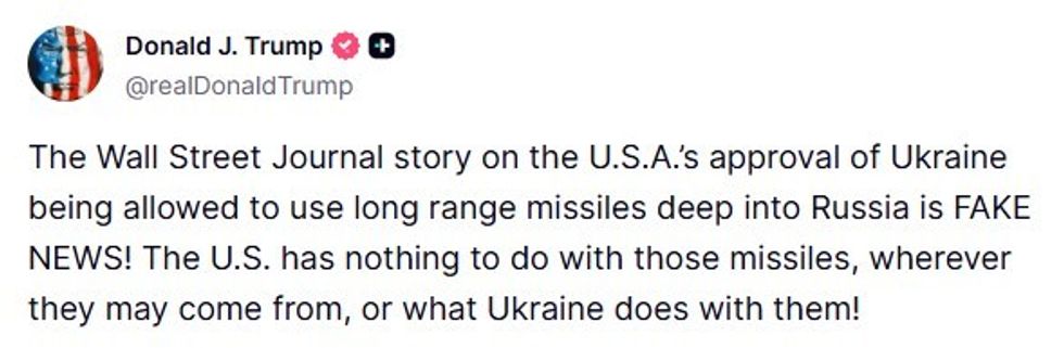 “Artikulli i Wall Street Journal mbi miratimin e SHBA-së që Ukraina të lejohet të përdorë raketa me rreze të gjatë veprimi thellë në Rusi është LAJM I RREMË! SHBA-të nuk kanë të bëjnë fare me ato raketa, ngado që të vijnë, apo me atë që bën Ukraina me to!”, ka shkruar Trump në rrjetet sociale, përcjell Telegrafi.