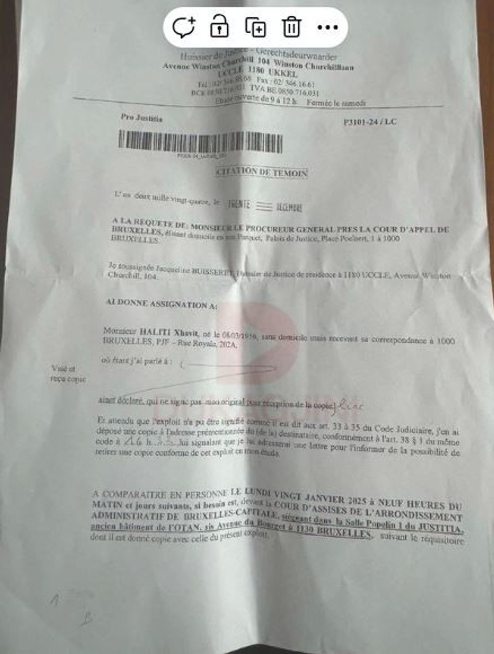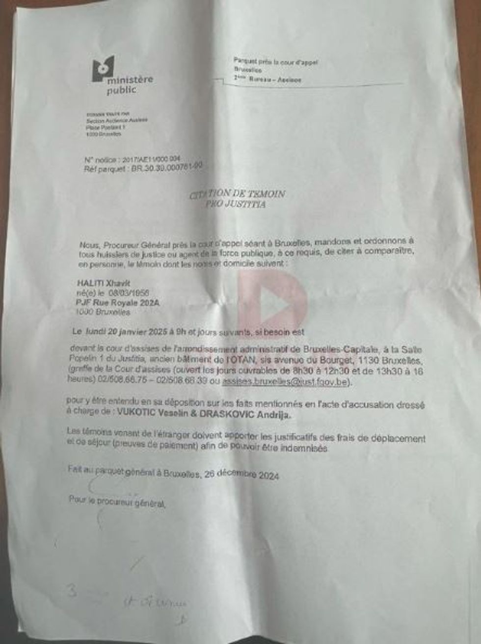 “Më datë 26 dhjetor 2024, Prokurori i Përgjithshëm pranë Gjykatës së Apelit në Bruksel ka lëshuar një ‘Citat të Dëshmitarit’ për Xhavit Haliti, i cili është thirrur të dëshmojë përpara Gjykatës së Assises në lidhje me akuzat ndaj të pandehurve Veselin Vukotiq dhe Andrija Draskoviq.