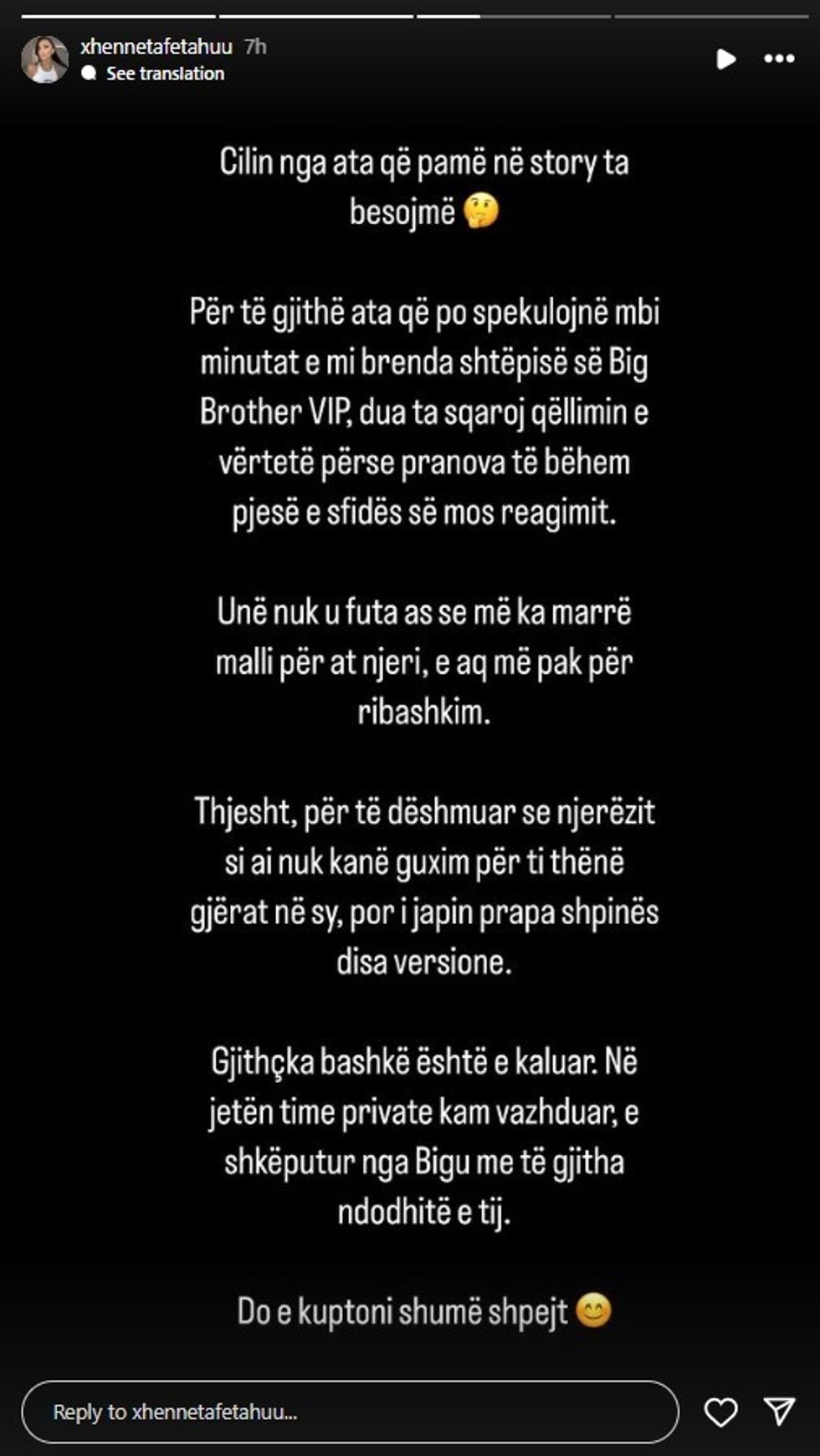 Deklarata e plotë e Xheneta Fetahut:"Cilin nga ata që pamë në story ta besojmë? Për të gjithë ata që po spekulojnë mbi minutat e mi brenda shtëpisë së Big Brother VIP, dua ta sqaroj qëllimin e vërtetë përse pranova të bëhem pjesë e sfidës së mosreagimit. Unë nuk u futa as se më ka marrë malli për atë njeri, e aq më pak për ribashkim. Thjesht, për të dëshmuar se njerëzit si ai nuk kanë guxim për t'i thënë gjërat në sy, por i japin prapa shpinës disa versione. Gjithçka bashkë është e kaluar. Në jetën time private kam vazhduar, e shkëputur nga Bigu me të gjitha ndodhitë e tij. Do ta kuptoni shumë shpejt."