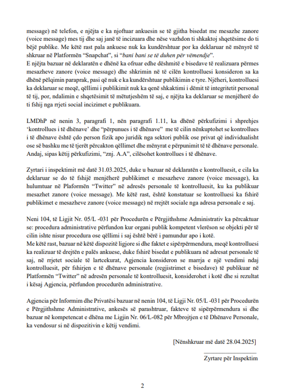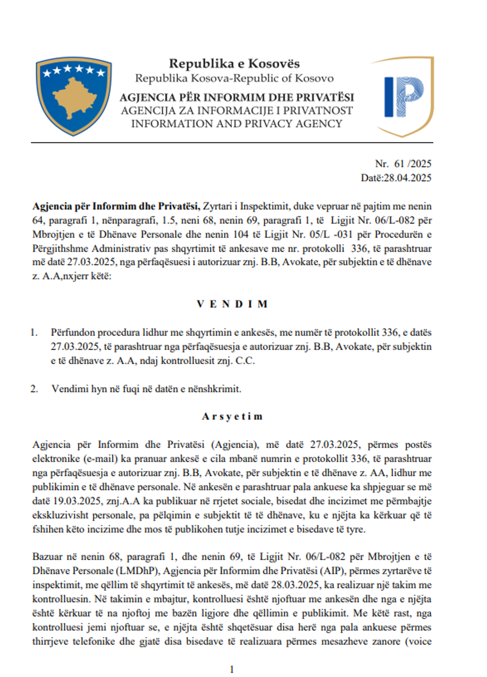 Në përfundim, AIP vlerësoi se qëllimi i ankesës – fshirja e incizimeve – ishte realizuar dhe, bazuar në ligj, nuk kishte arsye për të ndërmarrë masa shtesë ndaj palës, në këtë rast ndaj Xhenetës që kishte publikuar përmbajtjen. Prandaj, procedura administrative u mbyll.