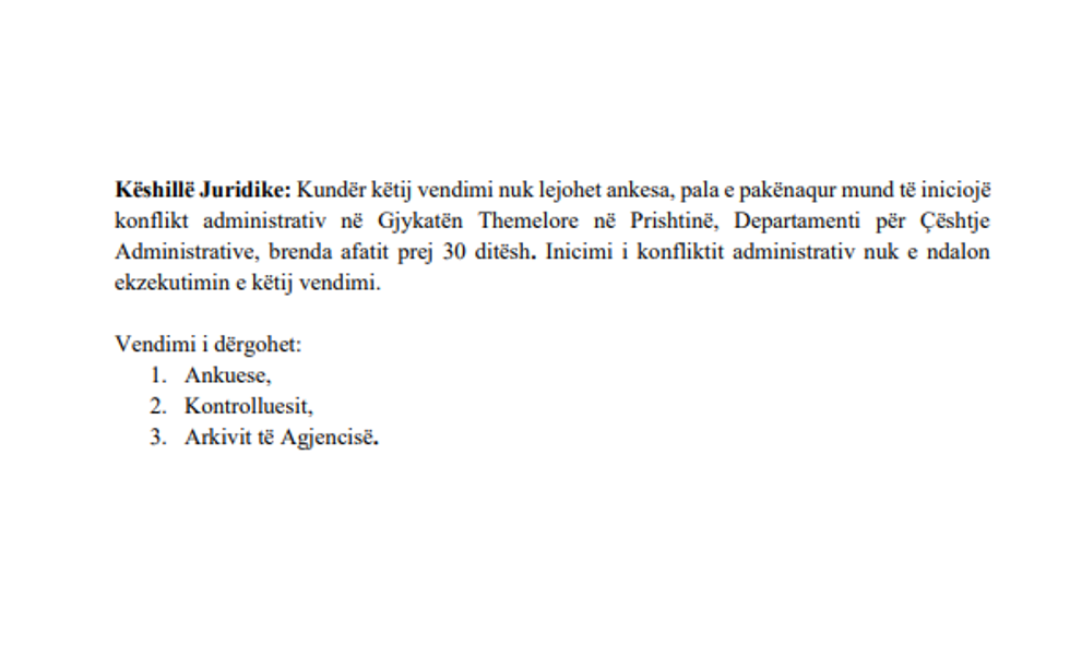 Në vendim theksohet se kundër këtij vendimi nuk lejohet ankesë administrative, por pala e pakënaqur mund të paraqesë kërkesë për konflikt administrativ në Gjykatën Themelore në Prishtinë, brenda 30 ditësh.