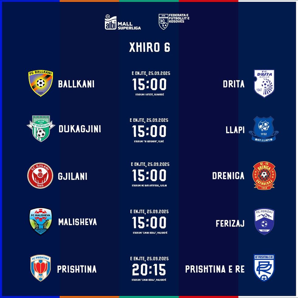 Federata e Futbollit të Kosovës ka publikuar orarin e xhiros së gjashtë, ku të gjitha ndeshjet luhen ditën e enjte me fillim nga ora 15:00.